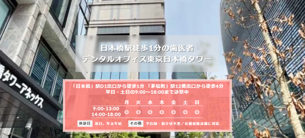 日本橋の歯医者でおすすめの「デンタルオフィス東京日本橋タワー」は、駅から徒歩1分であり、さらに土日も診療を受け付けています。